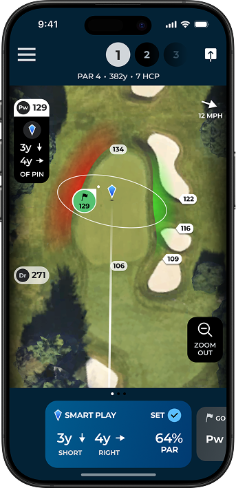 The AI Caddie solves this with a deliberate opt-in pattern. Tap the Caddie button and the UI shifts to a blue color scheme, a clear visual signal that you've entered a different mode. Dispersion circles overlay the map showing where your typical shot pattern lands relative to hazards. A Smart Play recommendation in the sheet shows the optimal club and target line.