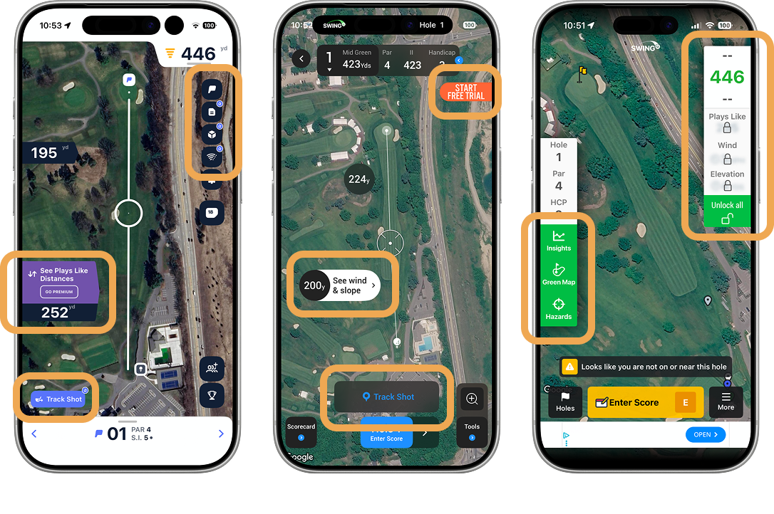 I audited every major competitor: Hole 19, 18Birdies, SwingU. All freemium, all cluttered with upsell prompts and banner ads (components circled in orange all led to upsells). Being a paid app, we had a huge opportunity to differentiate ourselves with a clean, premium, user-first UI.