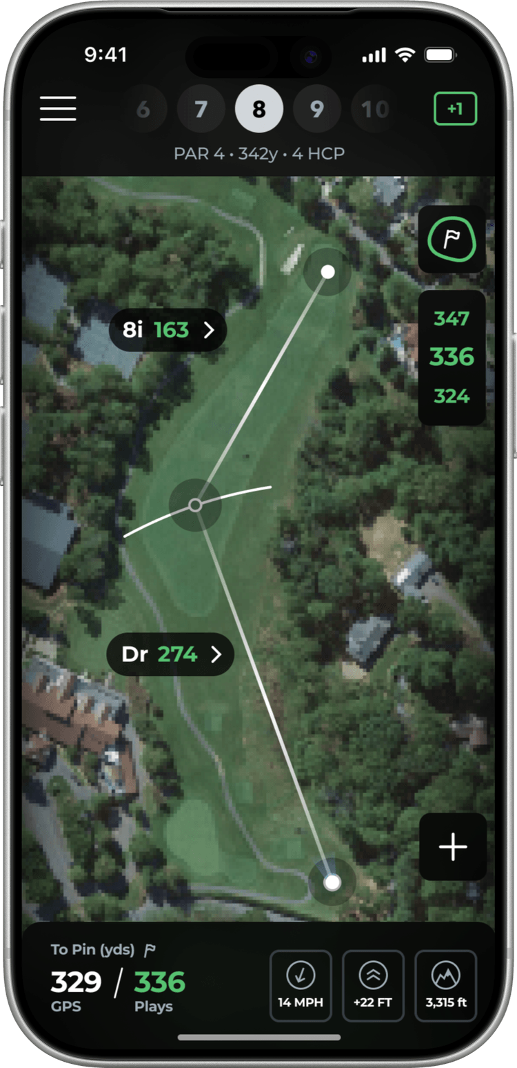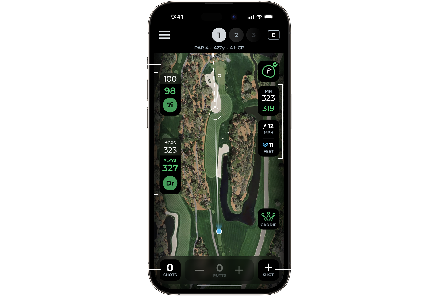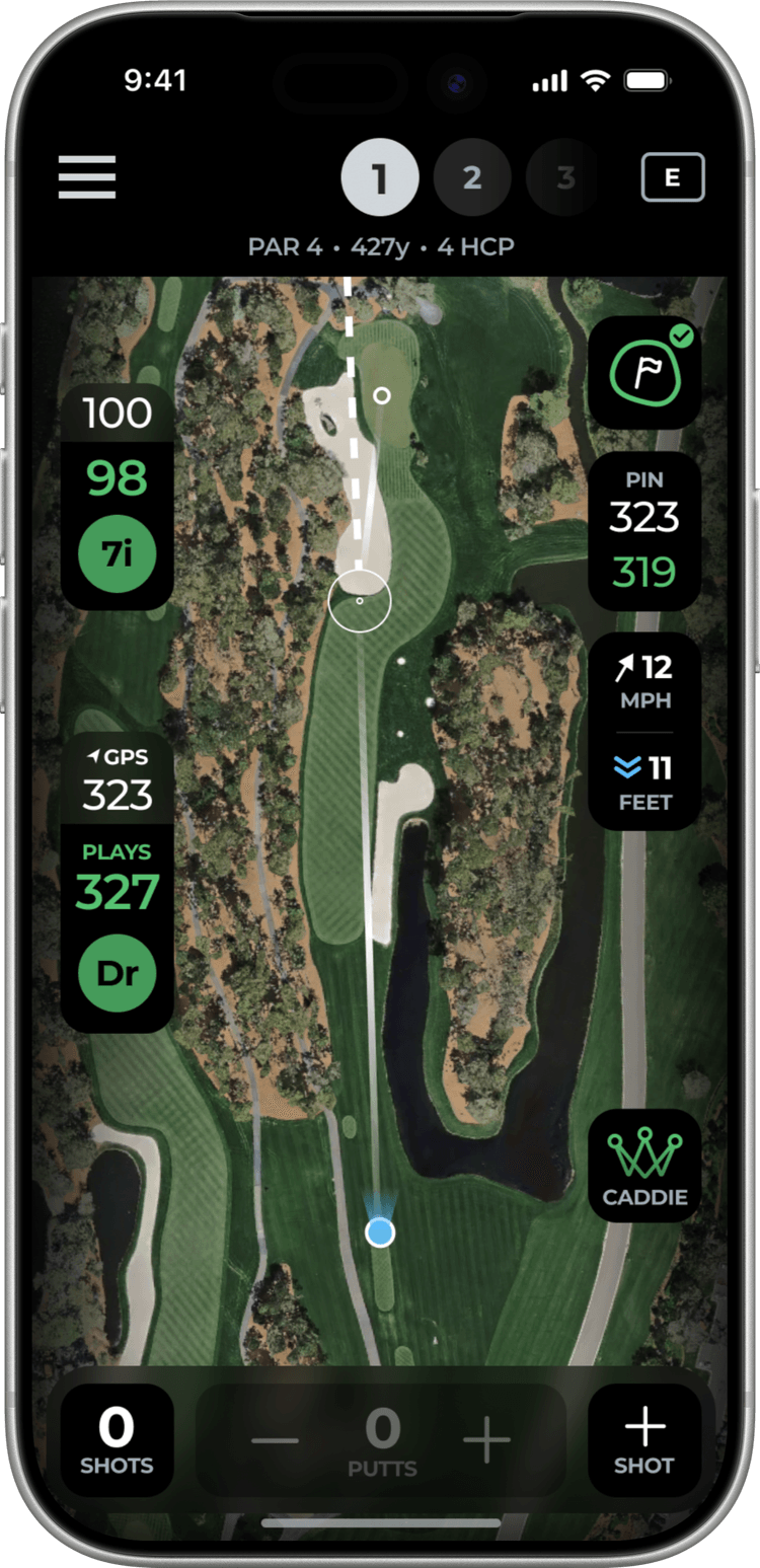 The winning direction. Pin distance sits directly beneath the flag icon. Wind and elevation are grouped in the top right. Each shot's data is clustered together on the left. A dedicated shot counter and putt increment controls sit at the bottom so users can adjust without opening a menu. A clear Caddie button provides an entry point for power users who want strategic overlays.