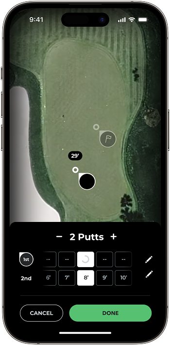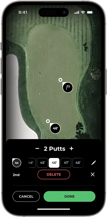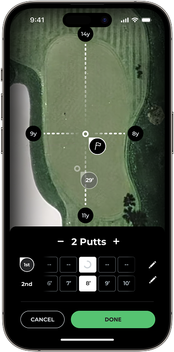 I designed a dedicated green view: a zoomed-in overhead editor where you tap to place putts on a distance grid. Simple controls set putt count and adjust each putt's position. Combined with new ML models from the engineering team, putting data went from unreliable to accurate enough to power real recommendations.