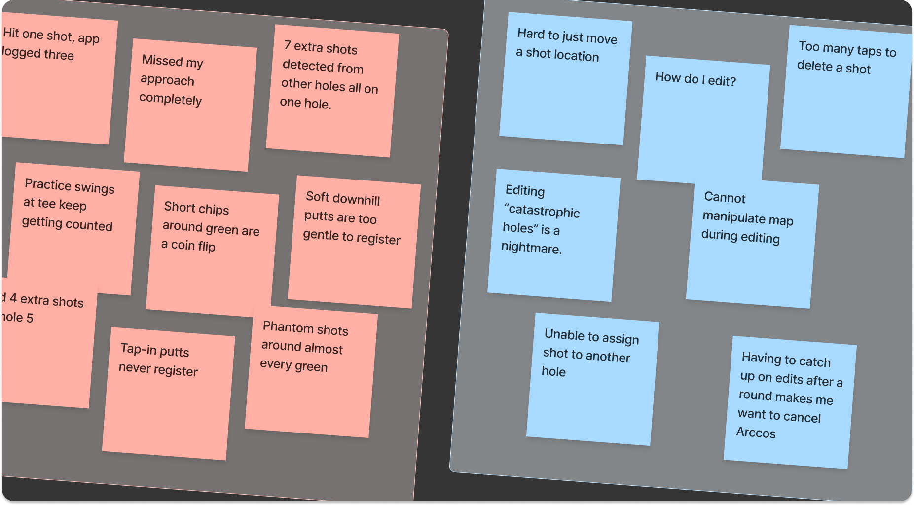 User interviews. 15-minute calls with a couple dozen members of our beta group. These were Arccos's most engaged users, people who played 3-4 times a week and genuinely wanted the product to succeed. My logic was: if these users were struggling, casual users didn't stand a chance.