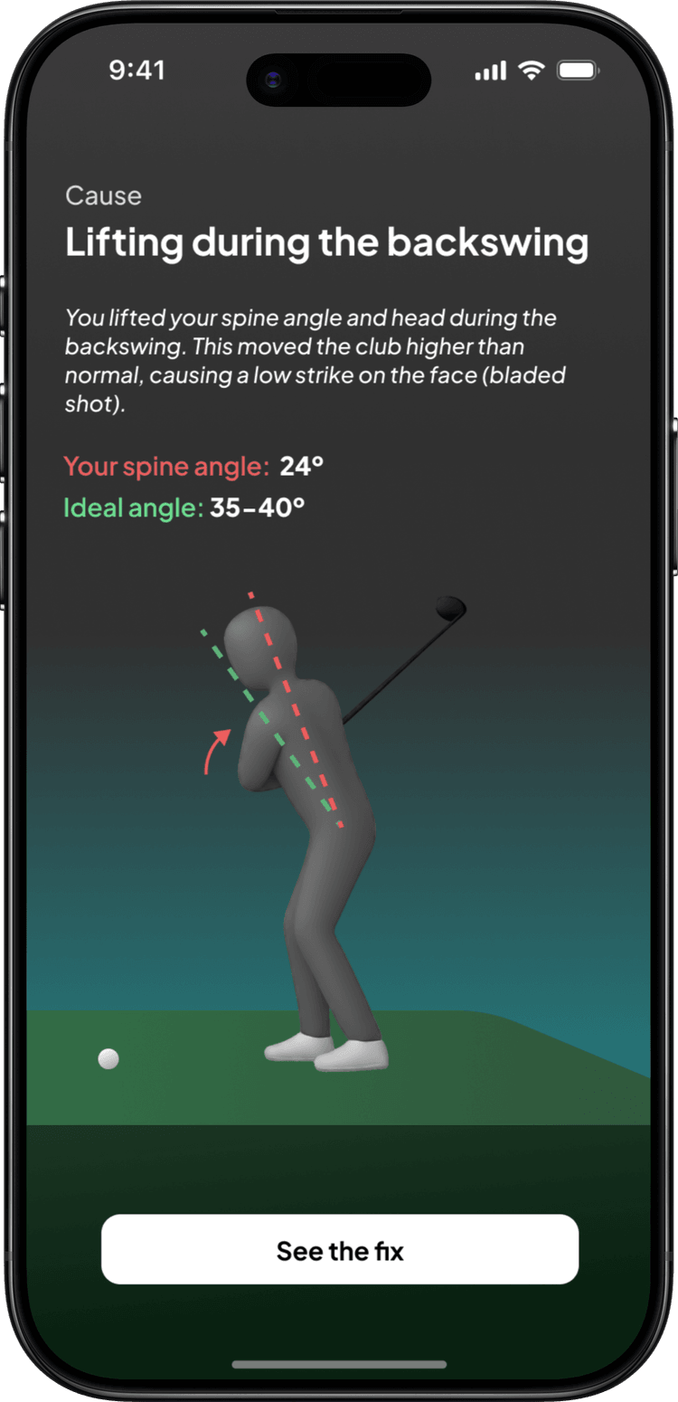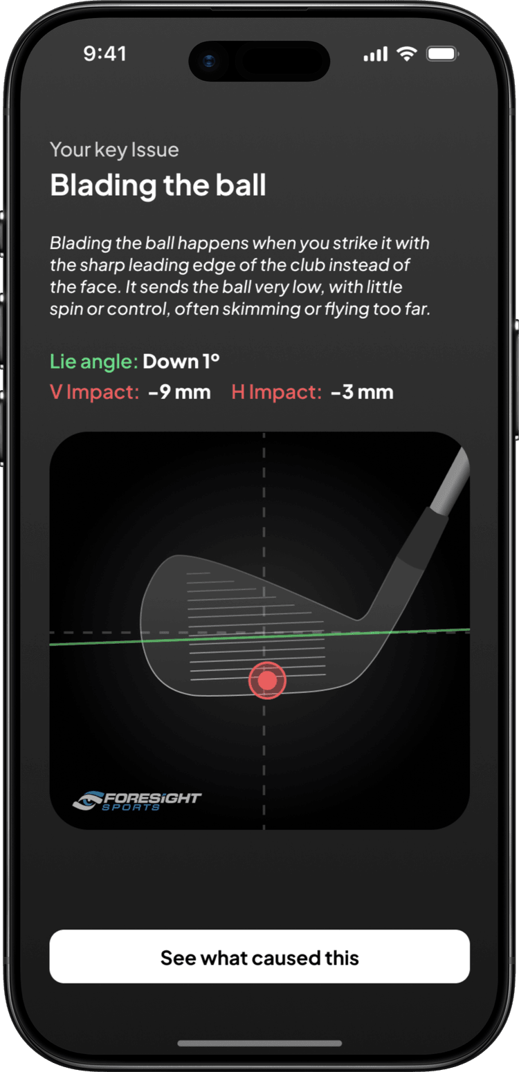 The key issue screen is where data turns into coaching. It names the problem in plain language, "blading the ball," and bridges to the biomechanical cause. From there, the golfer gets one thought to take back to the range. Not a lesson plan, not a video library. One thing. Below are alternate treatments using either the player image, or a generic 3d model.