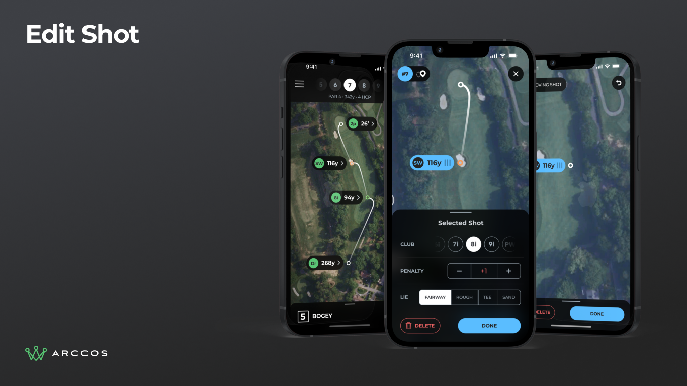 Edit Shot is one tap away. Tap any yardage tag on the map to select the shot, then edit club, penalty, and lie from one panel. Drag the shot to reposition it right from edit mode.