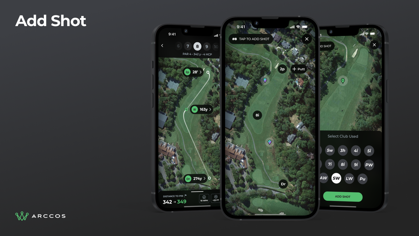 Add shot flow showing TAP TO PLACE SHOT header with the action surfaced at the top level, no menus required.