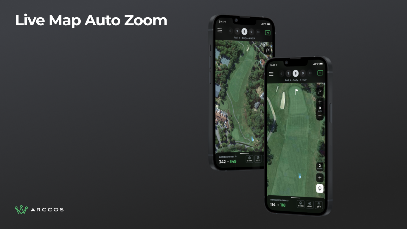 Auto-zoom frames the player's current situation automatically. No manual zooming to find your ball after walking to the next shot.
