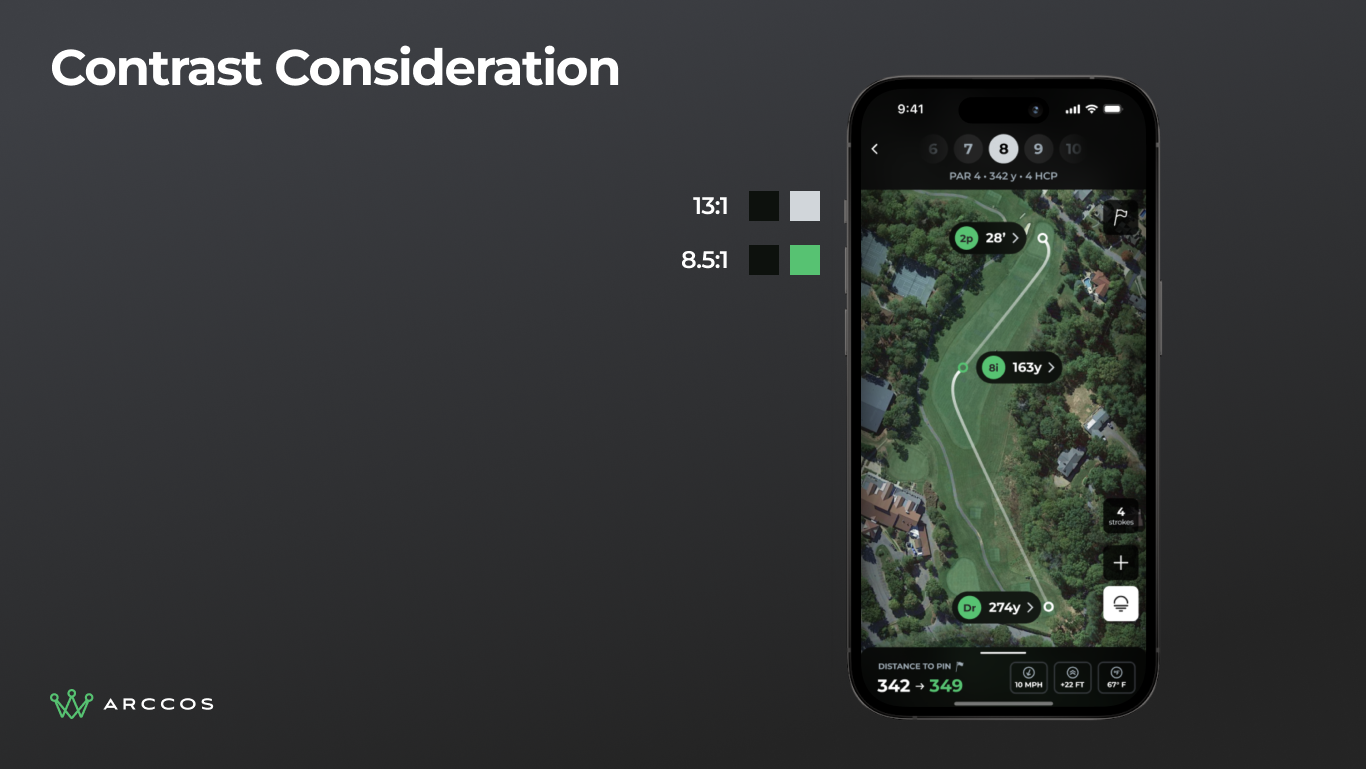 Functional color and type. Colors match real-world counterparts: green for fairway, sand for bunker. The typography hierarchy is optimized for arm's-length reading, not pixel-peeping on a monitor.