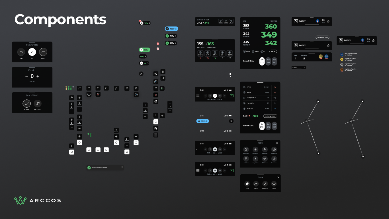 Rather than designing one-off screens, we built a component system that could grow with the product. Every element (from distance badges to shot markers to tray states) is a reusable component with documented behavior.