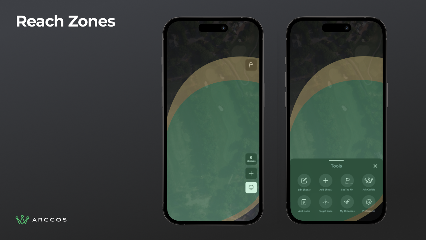 Reach zones overlay colored arcs on the map showing how far you can hit with each club. It turns abstract yardage into something easier to read at a glance.