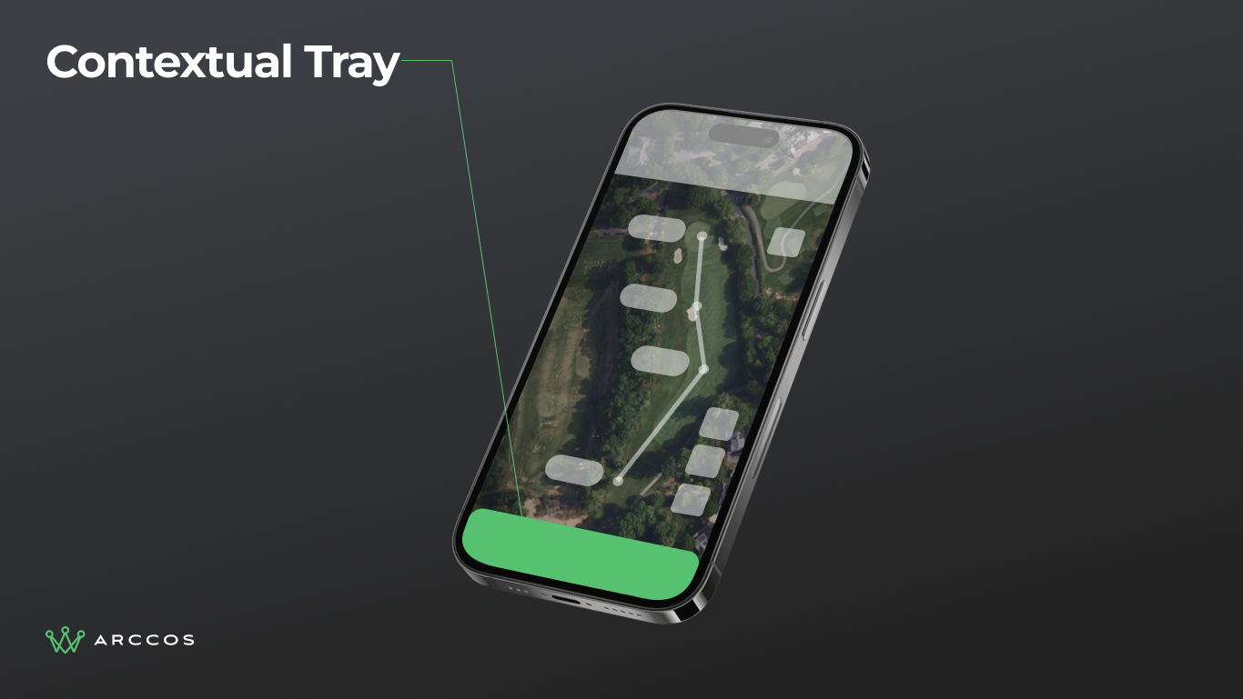 The bottom tray adapts to where the golfer is on the course. Standing on the tee? It shows front, middle, and back distances. Near the green? It switches to pin distance. Pull up to expand, swipe down to collapse.