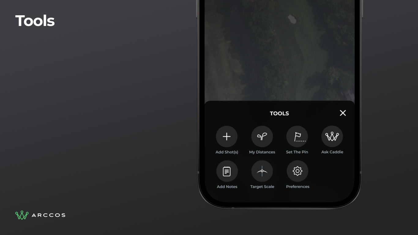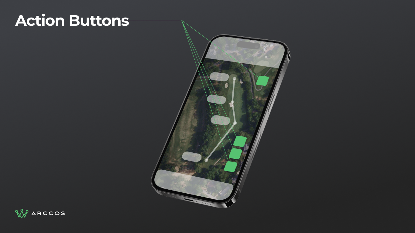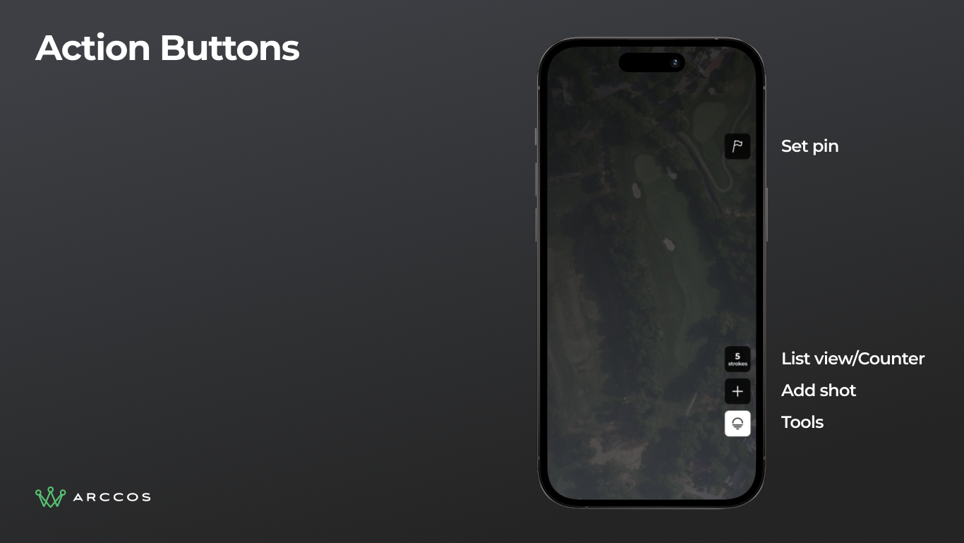 Action buttons change based on the situation. The most-used actions (set pin, add shot, view shot list) stay surfaced. Everything else lives in a tools overlay one tap away.