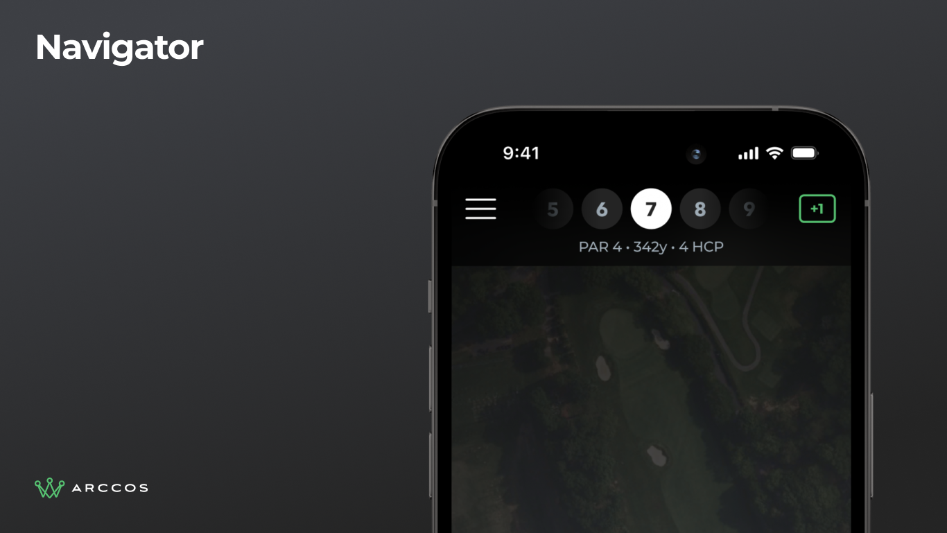 Navigator bar detail showing hole 7 with par, yardage, and handicap in a compact carousel pattern.