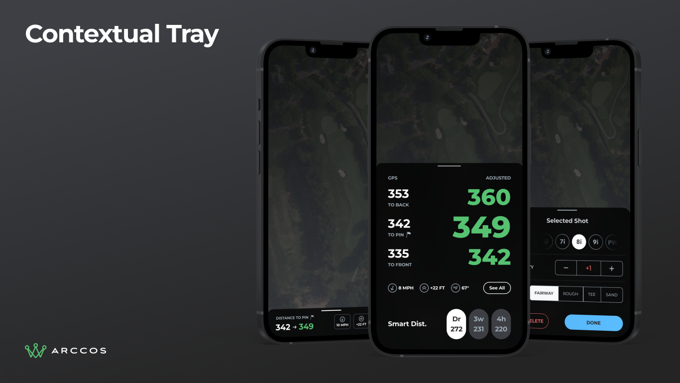 Three phones showing the contextual tray adapting to different course positions: tee distances, fairway Smart Club recommendations, and green pin distance.