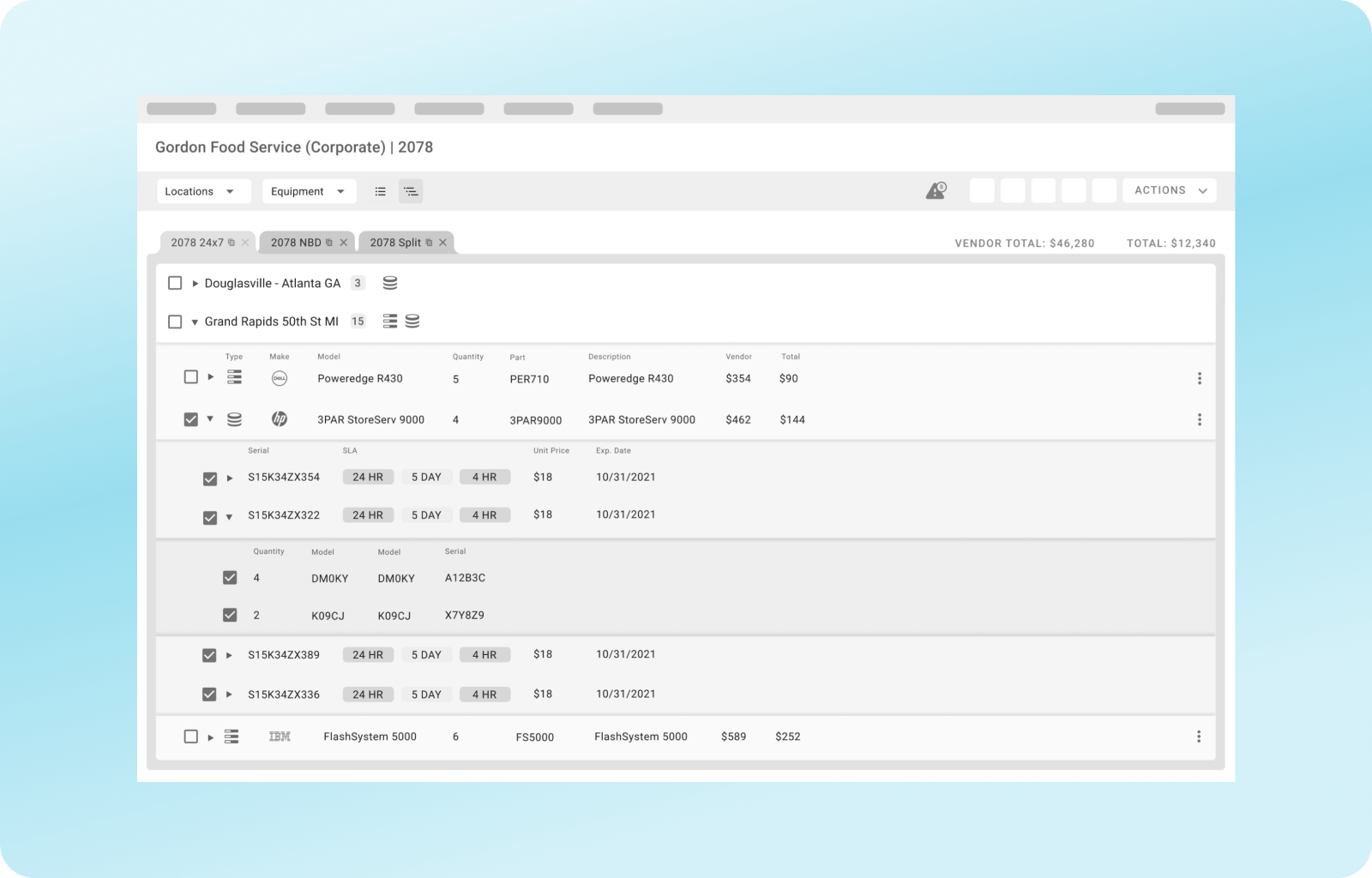 Based on early user feedback, the first real prototype organized equipment in a nested hierarchy: locations as collapsible groups, open quotes as tabs. It made logical sense on paper.