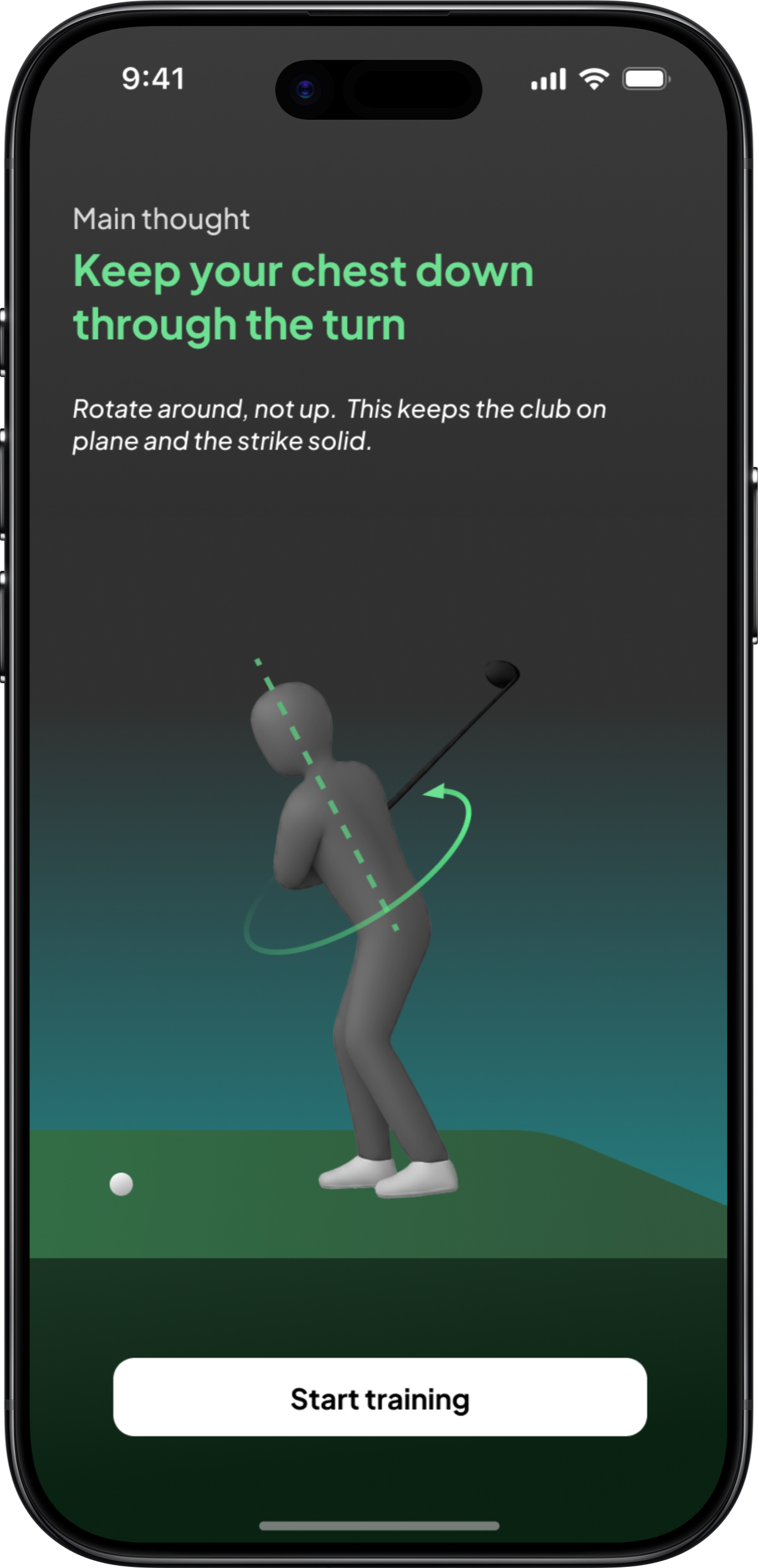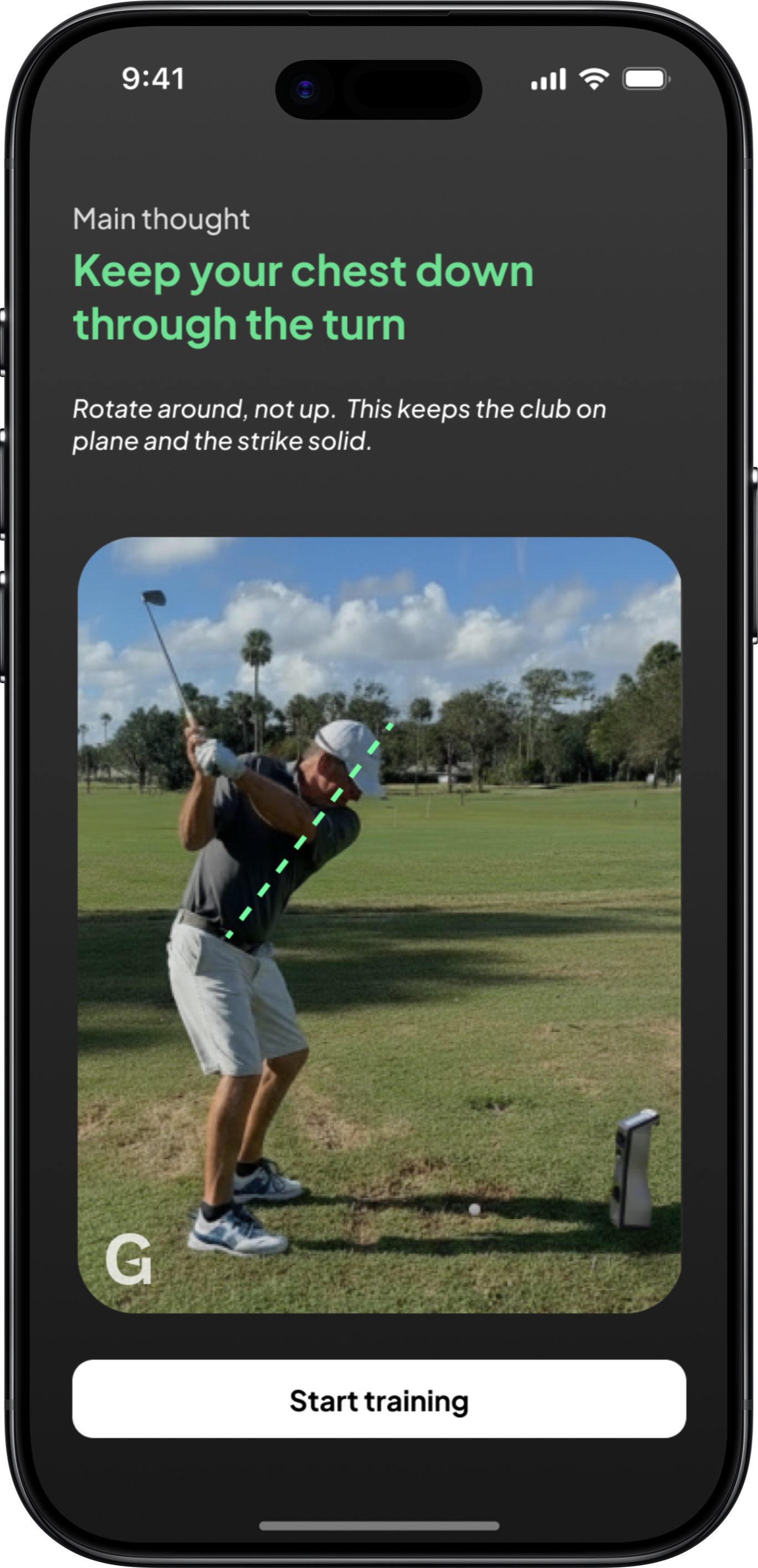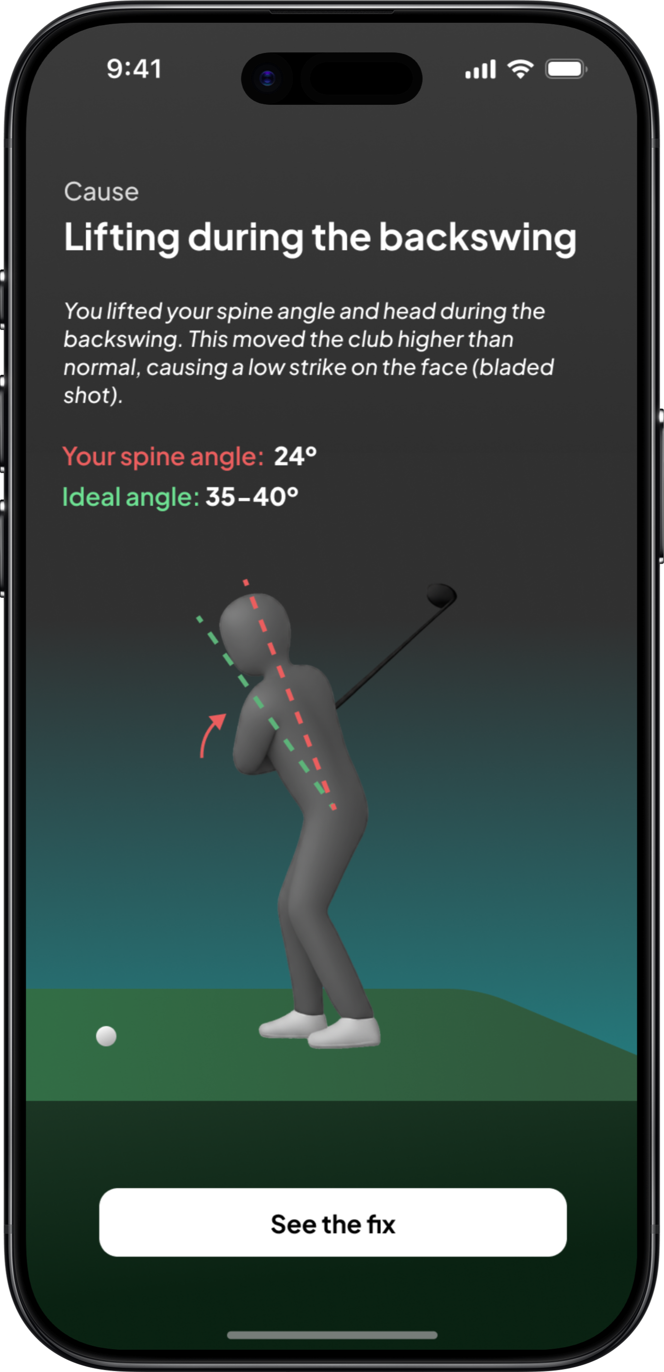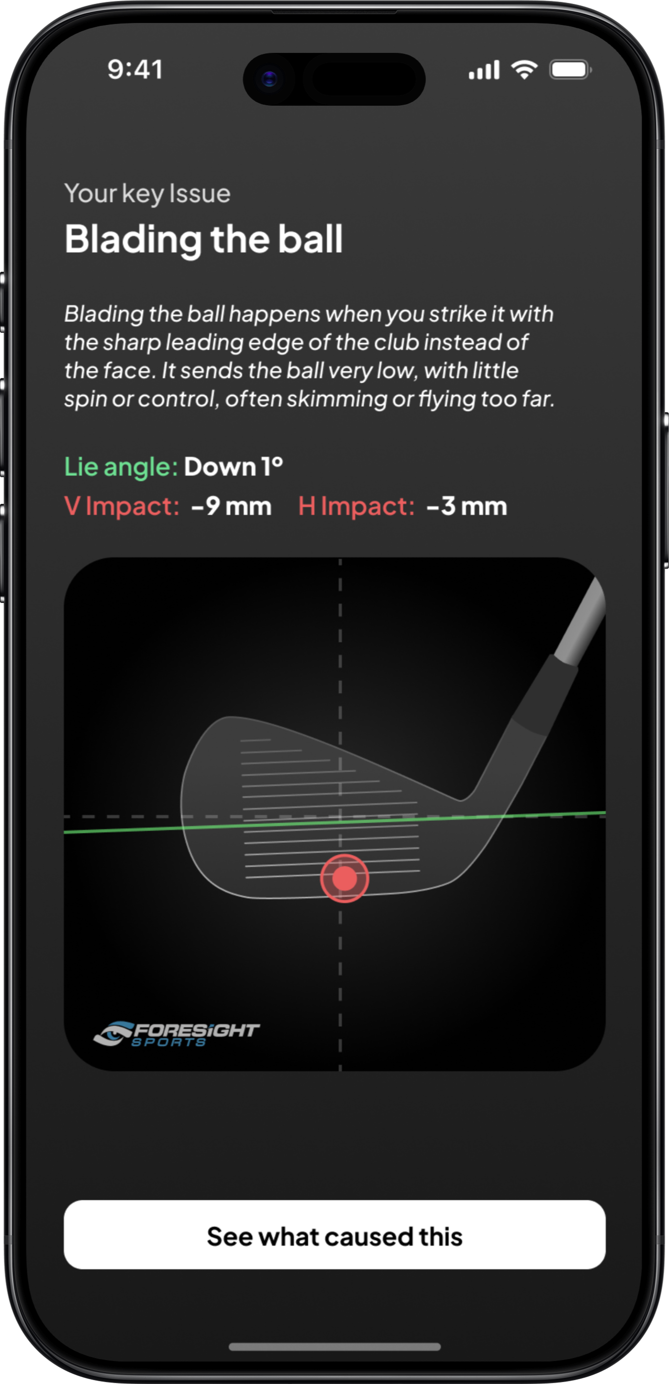 The key issue screen is where data turns into coaching. It names the problem in plain language, "blading the ball," and bridges to the biomechanical cause. From there, the golfer gets one thought to take back to the range. Not a lesson plan, not a video library. One thing.